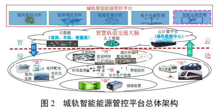 (3)绿色运营管理平台。基于线网城轨云平台和大数据平台的云数融合底座综合承载,围绕“能源全面感知、节能数据驱动”目标,构建匹配“线网-线路-站段”管理架构的智能能源管理平台。线网级侧重能源智能管理决策与评价,线路级侧重能源综合调度管理,站段级侧重能源系统互通互济、源网荷储协调互动调节,以智慧赋能能源的精细化管理,绿智融合,提升能耗计量和碳排放监测等智能能源管理能力,总体架构见图 2。